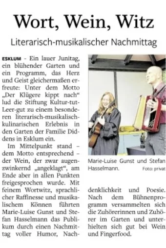 Ein wunderschöner Junitag, ein liebevoll gestalteter Garten und ein Programm, das Herz und Geist gleichermaßen anspricht: Unter dem Motto: „Der Klügere kippt nach“ lud die Stiftung Kultur-tut-Leer-gut zu einem literarisch-musikalisch-kulinarischem Erlebnis der besonderen Art ein.
