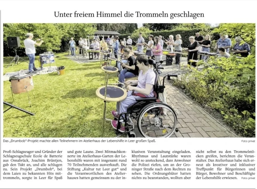 Im Garten des Atelierhauses der Lebenshilfe war ordentlich was los: Beim inklusiven Trommelprojekt „Drumbob“ haben Menschen mit und ohne Handicap gemeinsam den Takt angegeben – und zwar mit jeder Menge Spaß und Power! Bereits beim ersten Trommelschlag war spürbar, wie Musik Barrieren überwindet. Unter fachkundiger Anleitung erlernten die Teilnehmerinnen und Teilnehmer unterschiedliche Rhythmen und Techniken. Dabei ging es nicht um Perfektion, sondern um das gemeinsame Erleben von Musik, Freude und Teamgeist.